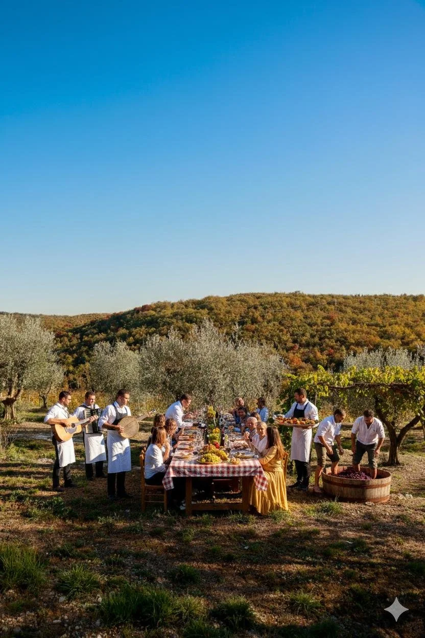 Celebrate the soul of the season with an authentic immersion into the world of Tuscan wine. More than just a meal, this is a tribute to the most cherished time of the year, where the hard work of the fields transforms into a vibrant community celebration. Your journey begins in the rows, where you will receive your traditional harvester’s kit and hat to join our team for the manual grape harvest.